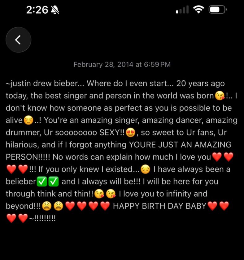 Other photos featured Eilish wearing Bieber merch, and one was a photo of her cellphone case with the “Baby” singer posing with a backward ball cap sans shirt. Eilish also posted a message she wrote Bieber on February 28, 2014, a few days before his 20th birthday. In it, she called him “SEXY,” “sweet,” “hilarious,” and “AN AMAZING PERSON.”